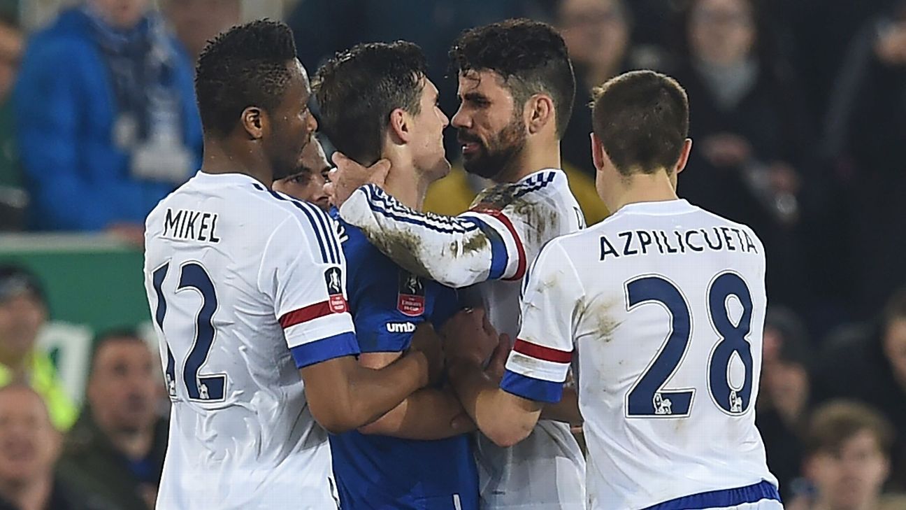 Chelsea striker Diego Costa was sent off in Saturday’s FA Cup defeat after placing his head and mouth on the neck of Everton’s Gareth Barry.